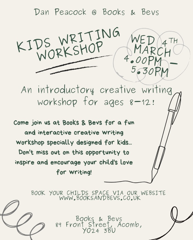 Dan runs monthly-ish creative writing workshops for kids in the Books & Bevs bookshop in York, UK.